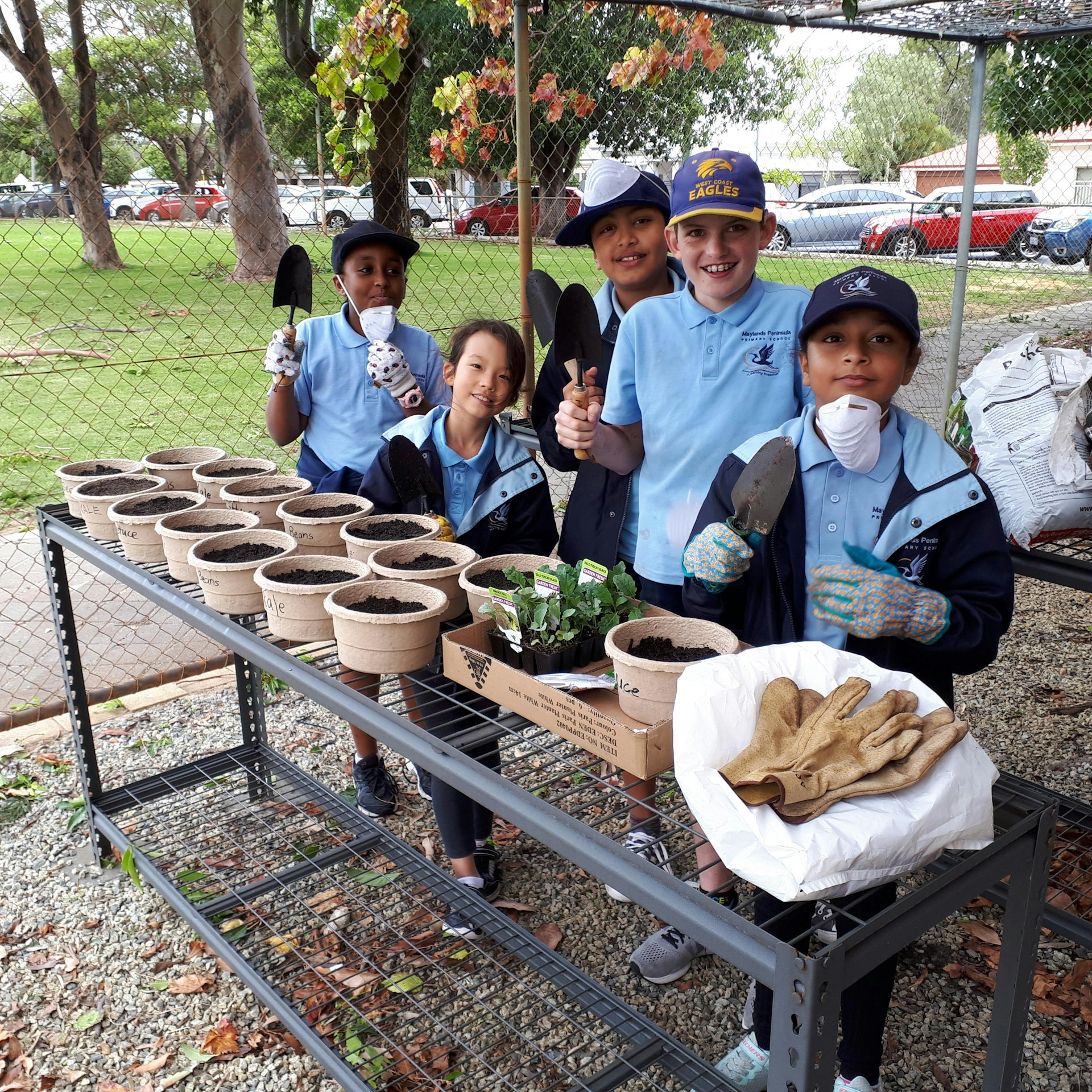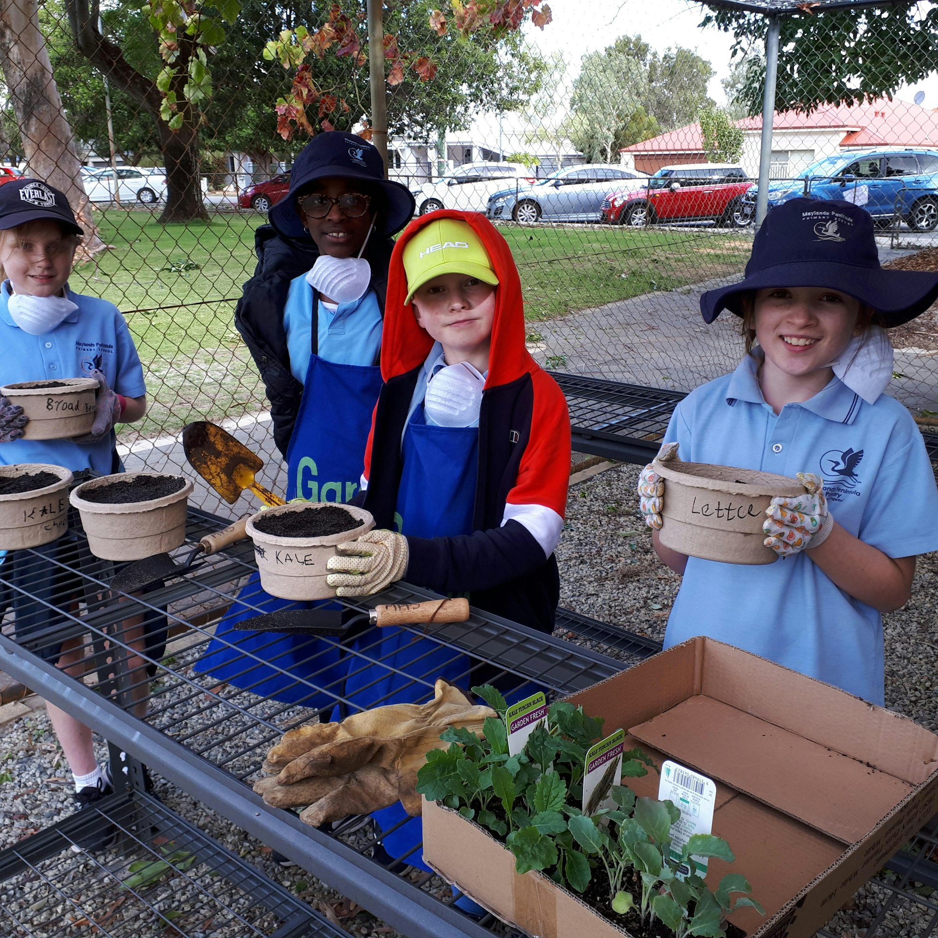 Last week, small groups of students started working in the garden again. To begin with, they planted seedlings of winter vegetables such as broad beans, kale and lettuces in compostable pots. It was great to work in the new nursery area behind the JB Block on very professional looking potting benches! Later, the students weeded the garden beds and aerated the compost bins. Good fun! Hopefully, soon, with restrictions being eased, we can have more gardening groups up and running again.