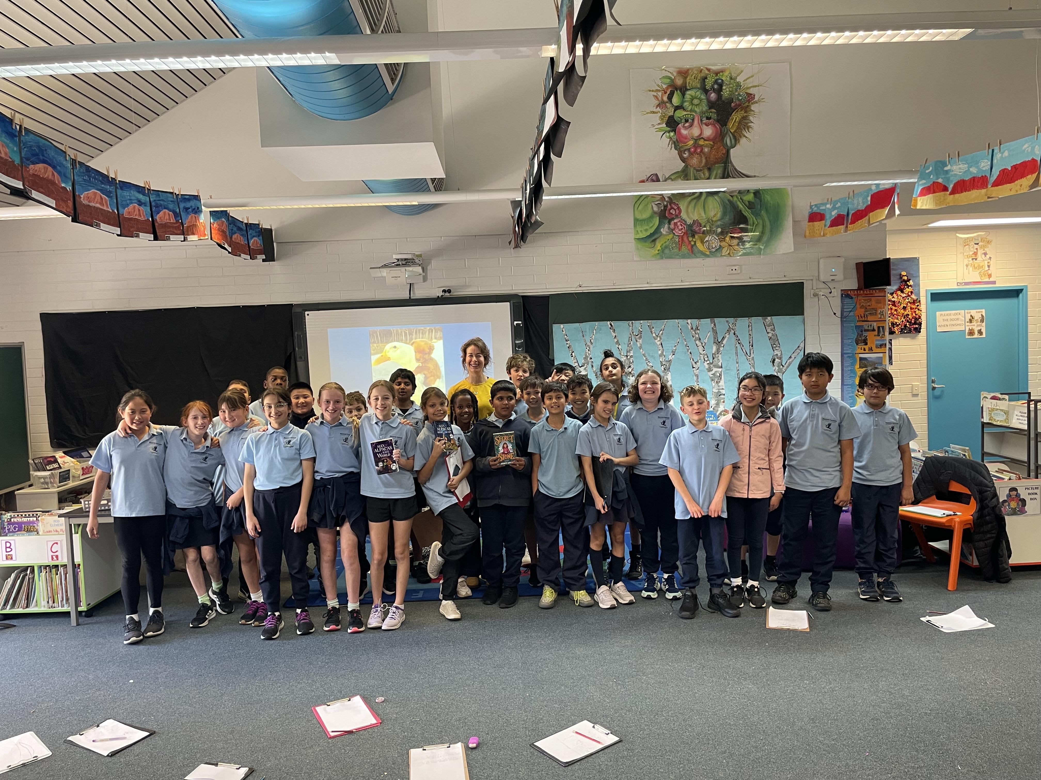 On Tuesday the 12th August the senior students had an author visit from Kathryn Lefroy in our library. She told us about her books such as Alex and the Alpacas as well as her other books like the Secret Stone. Kathryn also has a movie coming out called Whale Shark Jack and she told us some things about that. The classes were able to take part in their own writing activity, Kathryn showed us some pictures and we became authors too! There were three pictures that included stairs, underwear on a clothes line and a small puppy on a duck. Afterwards, Kathryn signed many autographs before we headed back to class. Thank you so much Kathryn for visiting MPPS and we hope you visit again!